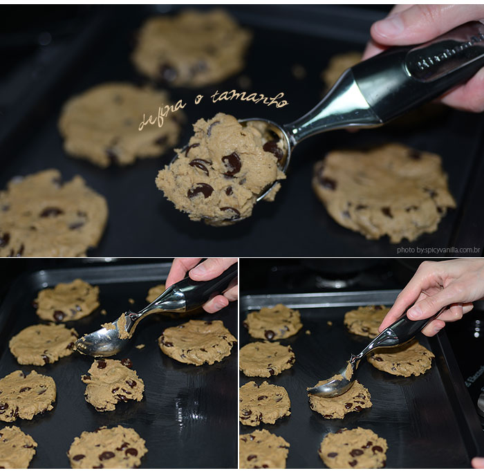 Pegue a massa com a colher e defina o tamanho do seu cookie (a massa deve estar bem firme neste momento). Os que eu faço tem em média 8 cm de diâmetro e 1,5 de altura.