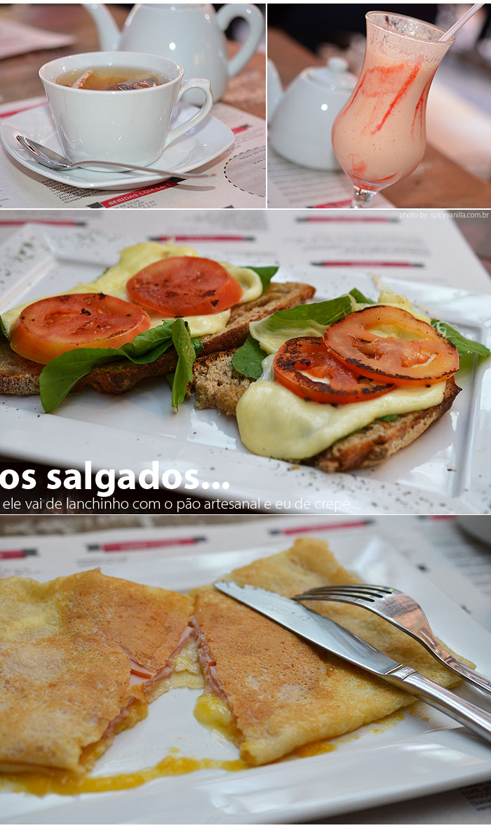 Desta vez o meu foco era me esbanjar nos crepes. Amo crepes de todos os tipos e os de lá são bem gostosos. O marido preferiu o pão artesanal com queijo e tomate que é delicioso.