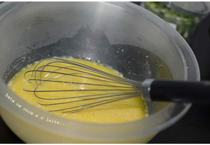 bolo_salgado_ovosColoque os ovos e o leite e o azeite em uma tigela e misture bem com um batedor de mão.
