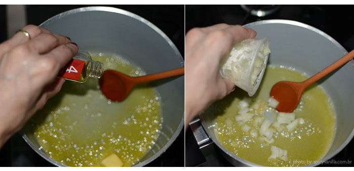 Em outra panela média ao fogo baixo, coloque o azeite e a manteiga. Quando a manteiga derreter, acrescente o alho e e a cebola e mexa até que a cebola esteja macia e quase transparente. Na receita eles falam que demora em torno de 2 minutos, mas eu demorei uns 5 pelo menos.