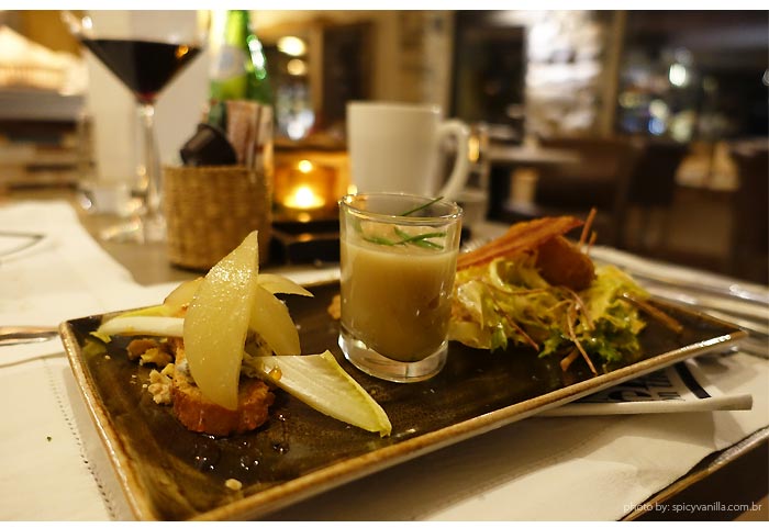 Uma entradinha com 3 opções. Brusqueta, sopinha e salada. Tudo muito bem apresentado e saborosíssimo. Combinação de sabores na medida.