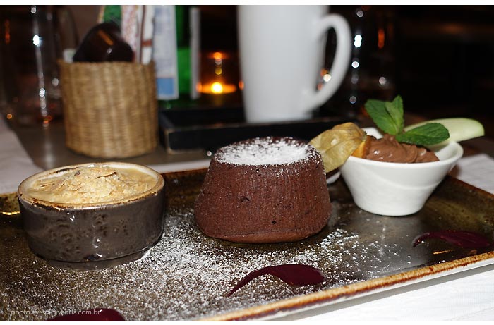 Agora a parte mais incrível de todas foi ter um prato de sobremesa com 3 opções. A minha escolha foi “Chocolate” e vieram 3 sobremesas com chocolate suiço de dar água na boca só de lembrar. Divino!!!