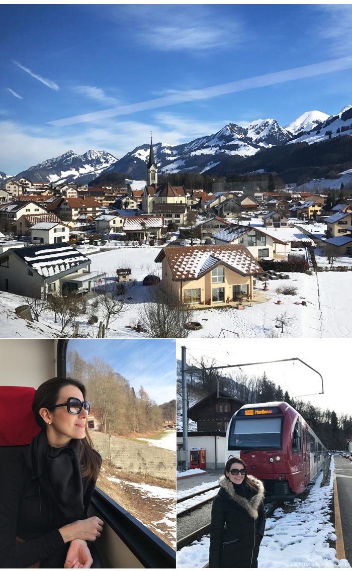 Nosso roteiro seria Montreux, parada em Broc para ver a fábrica e depois passar a tarde em Gruyére. O trem que sobe as montanhas é panorâmico da linha Golden Pass e está incluso no Swiss Pass (não precisa nem pagar reserva). No aplicativo da SBB Mobile você programa seu destino e já aparece tudo certinho: o trem que você tem que pegar, os horários e as plataformas. Para ir a Broc nos mudamos de trem duas vezes. Mas é super simples, em estações pequeninas e fofas. Só ficar de olho no letreiro do trem que indica os pontos que você tem que parar. É realmente muito fácil.