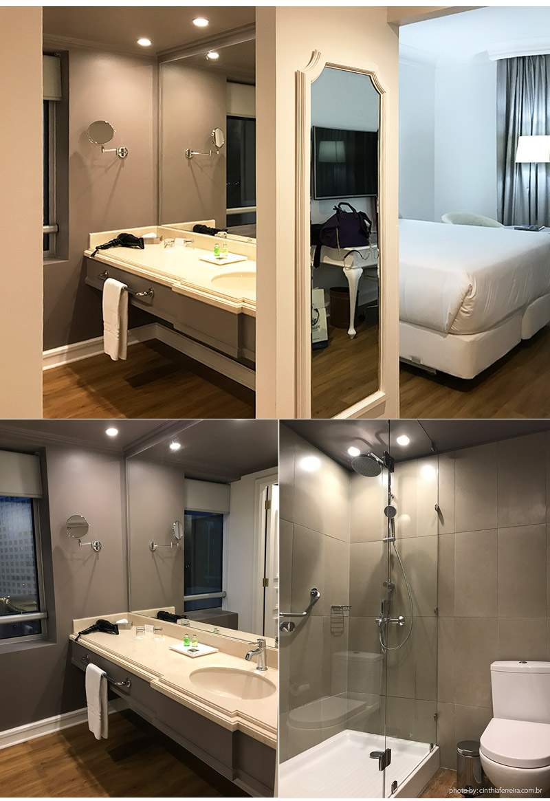 O banheiro tinha um bom tamanho e janela que pegada toda a lateral. Um bom espelho na parede (Ahhh como eu sinto falta quando o quarto não tem espelho de corpo inteiro) e um pequeno closet com espaço para colocar as malas.