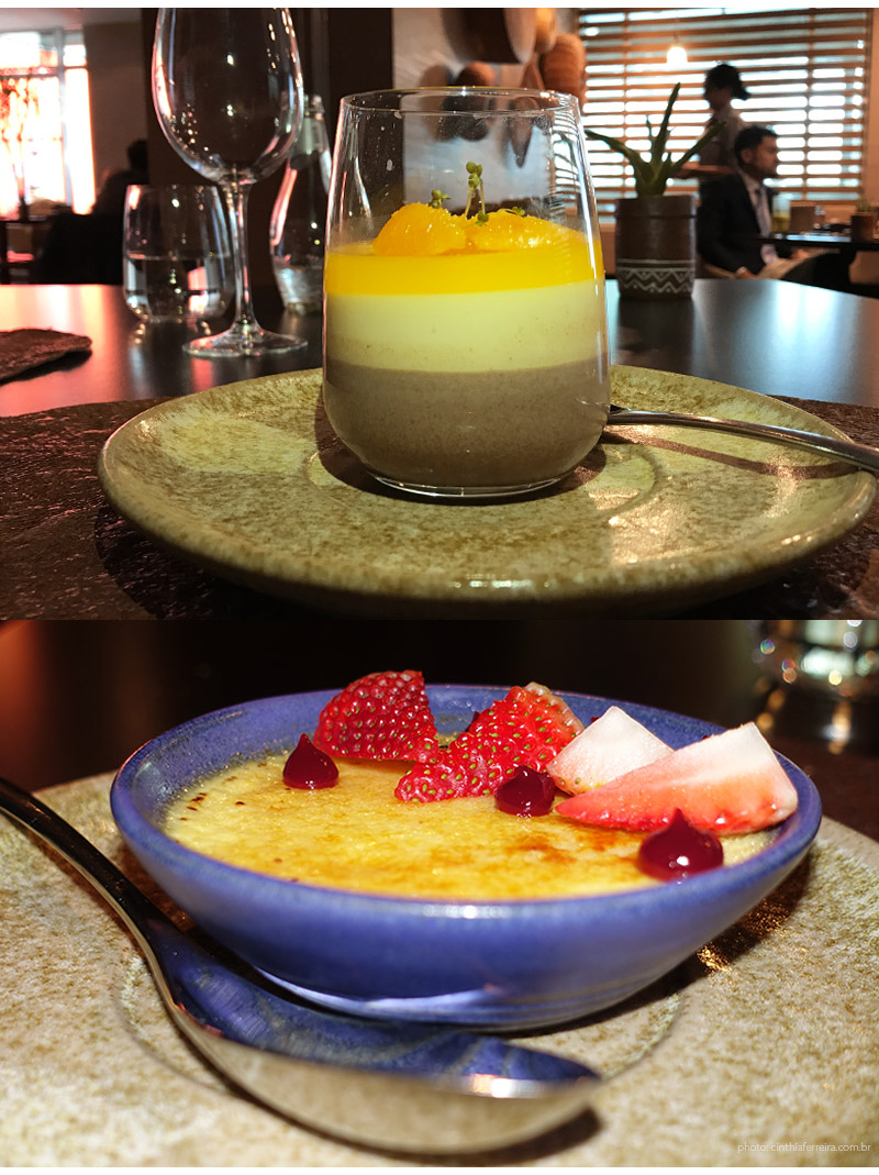 As sobremesas do almoço estavam melhores que as do jantar. Eu pedi uma sobremesa com chocolate e tangerina espetacular e ele foi de creme brulée.